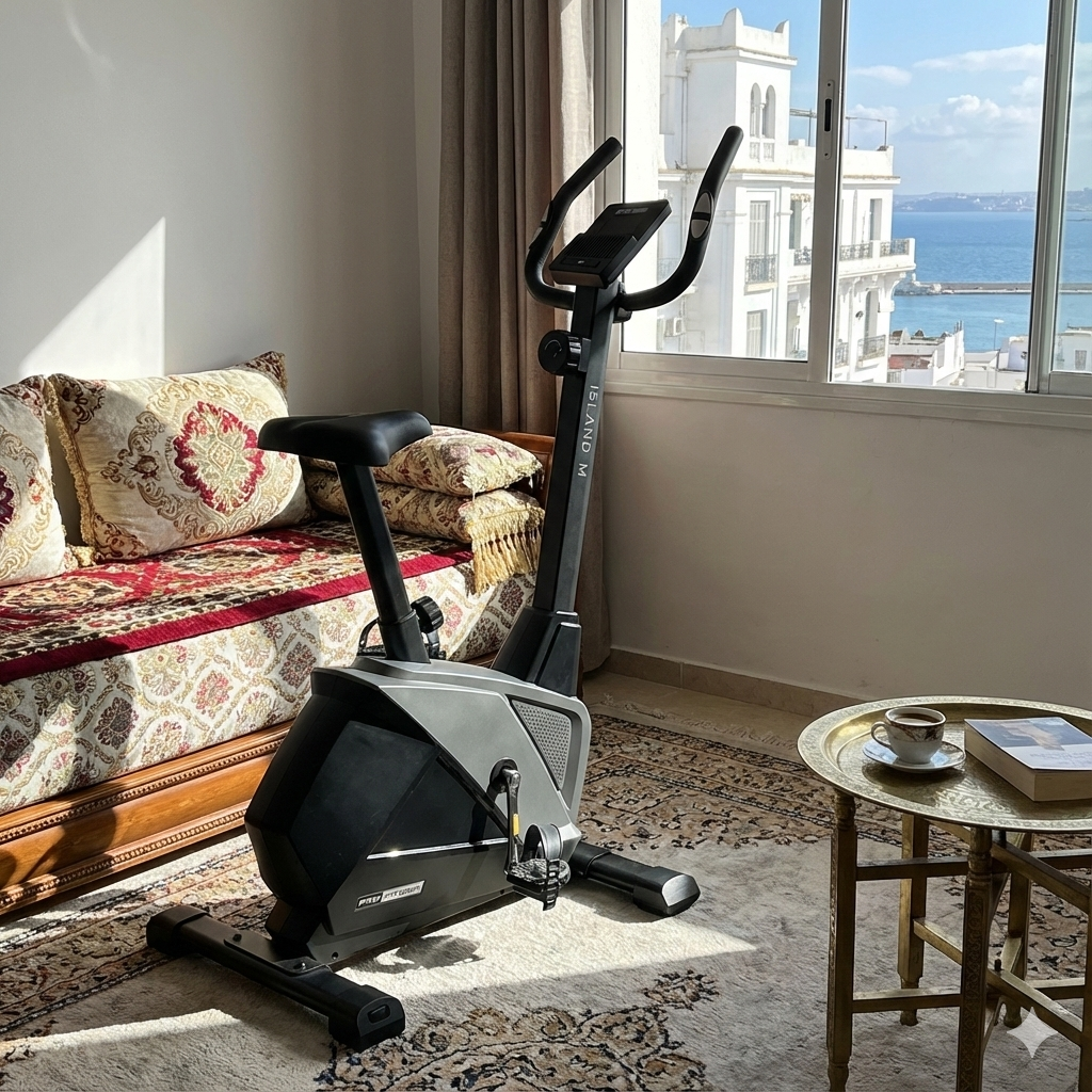 Vélo droit conçu pour les entraînements cardio intenses à la maison, simulant la sensation d’un vélo de route.